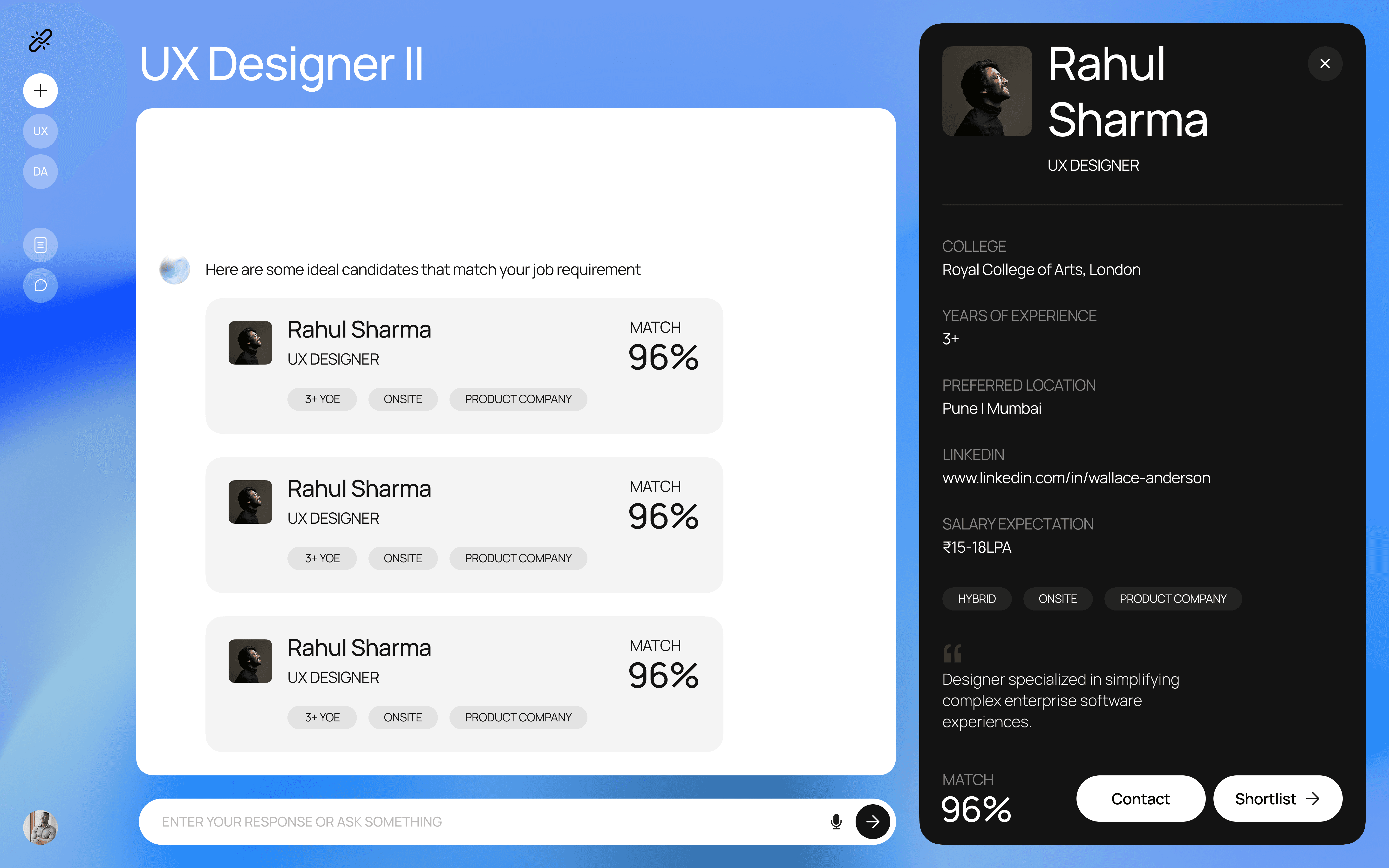 We decided on a split-screen layout where the left 70% is the chat interface, and the right 30% is a persistent profile or job-posting/ profile panel. as the user chats, the ai Updates this panel in real-time so that information doesn't get lost in scroll. recruiters and candidates can directly edit any section by calling out that section in the chat.